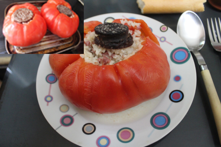 Como nos encaprichamos de dos enormes tomates, después toco consumirlos y pensé en realizarlos rellenos de arroz y jamón decorados con una rodajita de morcilla de arroz.