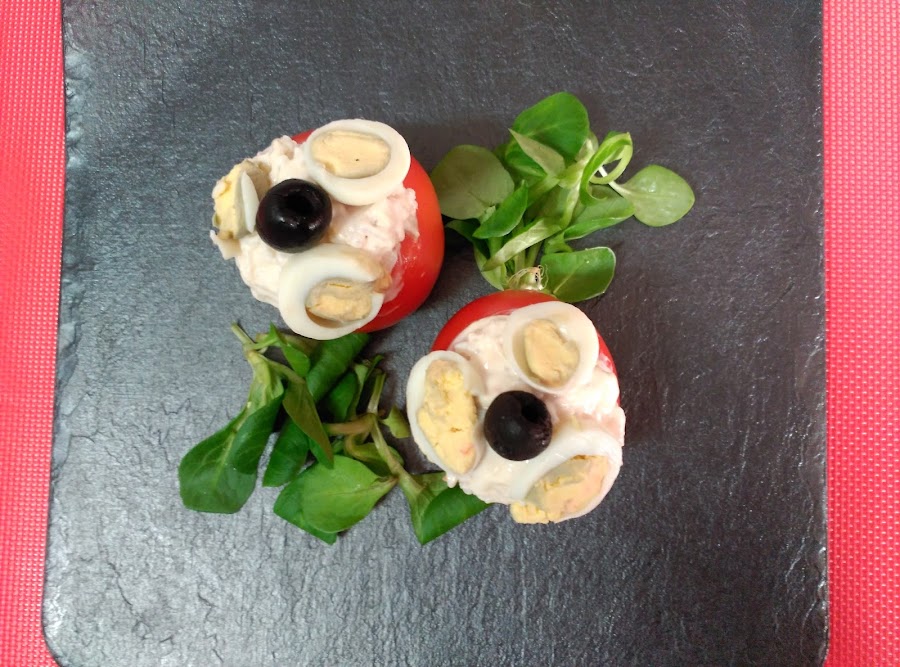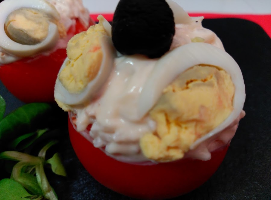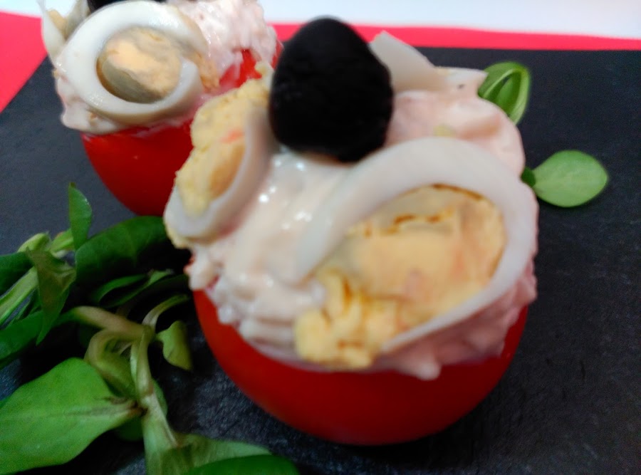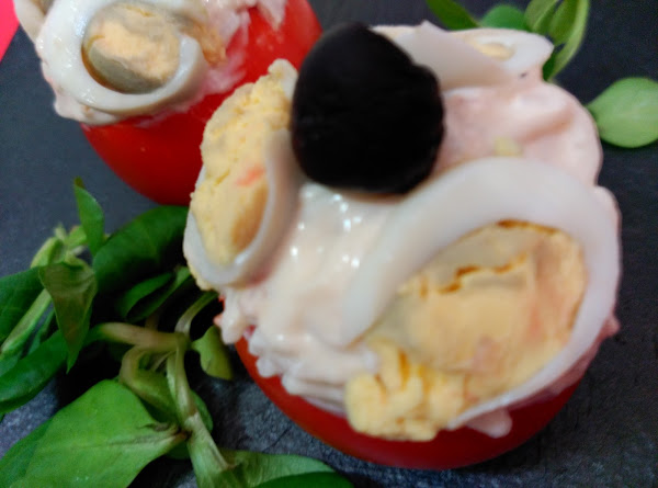 Rellena los tomates con esta mezcla, pon relleno hasta que sobre salga un poco del tomate. Pon otro poco de mayonesa para alisar.
