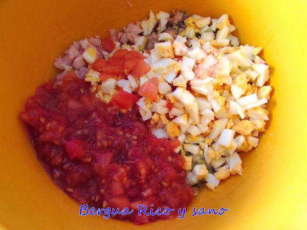 7. Troceamos lo que hemos sacado de los tomates y lo mezclamos con el atún escurrido, las gambas y el huevo picados, la cebolla picada, sal, pimienta y orégano o albahaca. Lo mezclamos todo bien y lo terminamos de ligar con la mayonesa.
