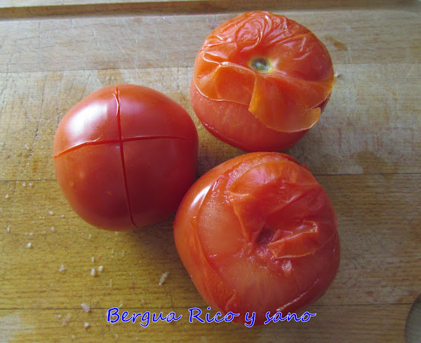 4. Así será muy fácil pelarlos. Tiramos de la piel donde habíamos hecho el corte en forma de cruz. Normalmente dejo la piel de las verduras porque tiene muchas vitaminas, pero para esta receta es más agradable sin ella.