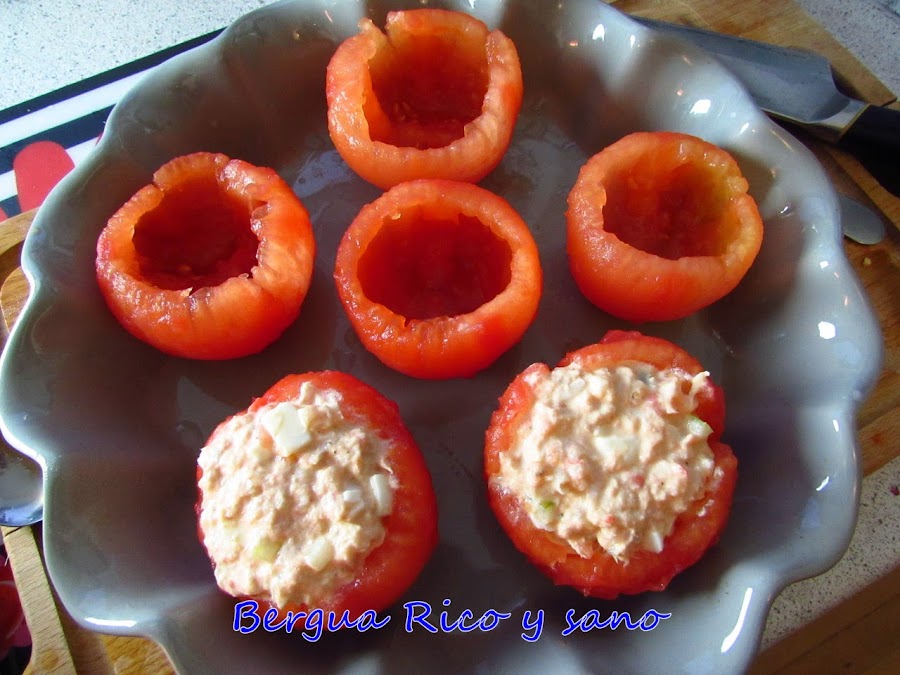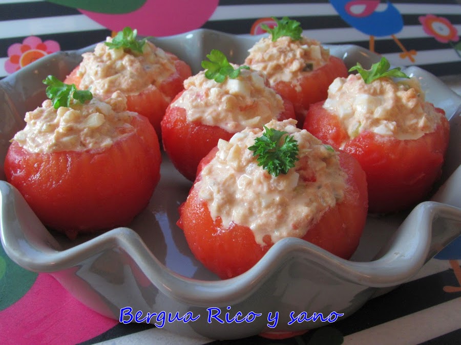 8. Rellenamos los tomates con la mezcla, decoramos con una hojita de perejil y los dejamos enfriar al menos 30 minutos, cuanto más, mejor, ya que los sabores se entremezclan y frío está mejor.