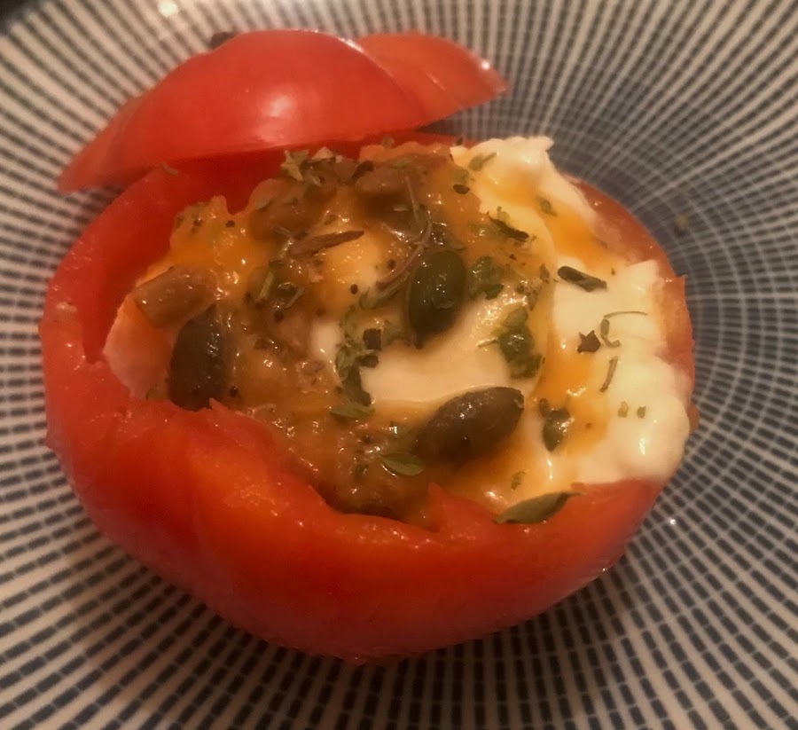 Pon en el centro de los platos los tomates con la abertura hacia arriba, pon una cucharada el aliño reservado, corta la burrata en 4 trozos y pon uno dentro de cada tomate, cubre con un poco de la vinagreta y tapa los tomates con el trocito que habías cortado al principio, espolvorea con orégano y ya puedes servir.