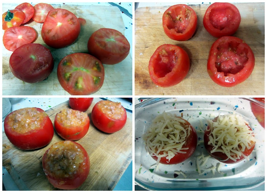 1. Primero de todo cortamos la copa de los tomates tal y como veis en la foto y luego los vaciamos con cuidado con la ayuda de una cuchara. Lo que sacamos lo reservamos en un plato para hacer luego el sofrito.