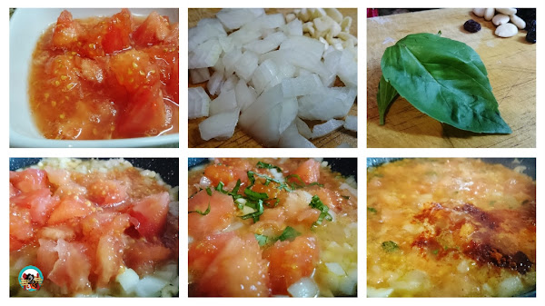 2.- Preparamos la salsa: Pelamos la cebolla y la picamos en dados pequeños, picamos también el ajo. Los sofreímos en una sartén con un poco de aceite de oliva. Añadimos la pulpa de tomate una pizca de sal y dejamos que se cocine todo unos 10 minutos removiendo de vez en cuando. Ponemos una cuchara pequeña de pimentón y las hojas de la albahaca fresca picada. Cocinamos 5 minutos más y retiramos del fuego.