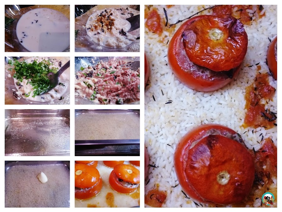 4.- Rellenamos los tomates con la mezcla de la carne, tapamos con la parte superior y rociamos con un poco de aceite de oliva.