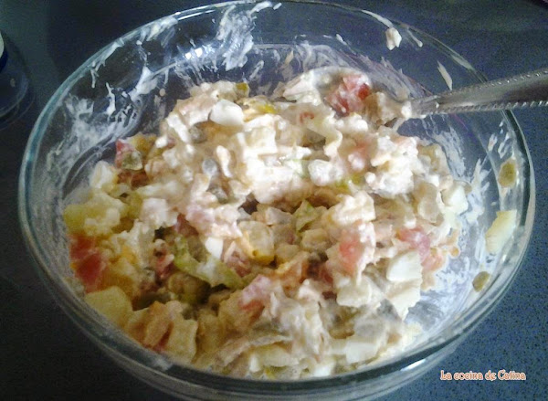Escurrir las patatas, dejar que se enfríen, pelarlas y cortarlas en daditos, lo mismo hacemos con los huevos cocidos. Colocar ambos ingredientes en un cuenco grande.