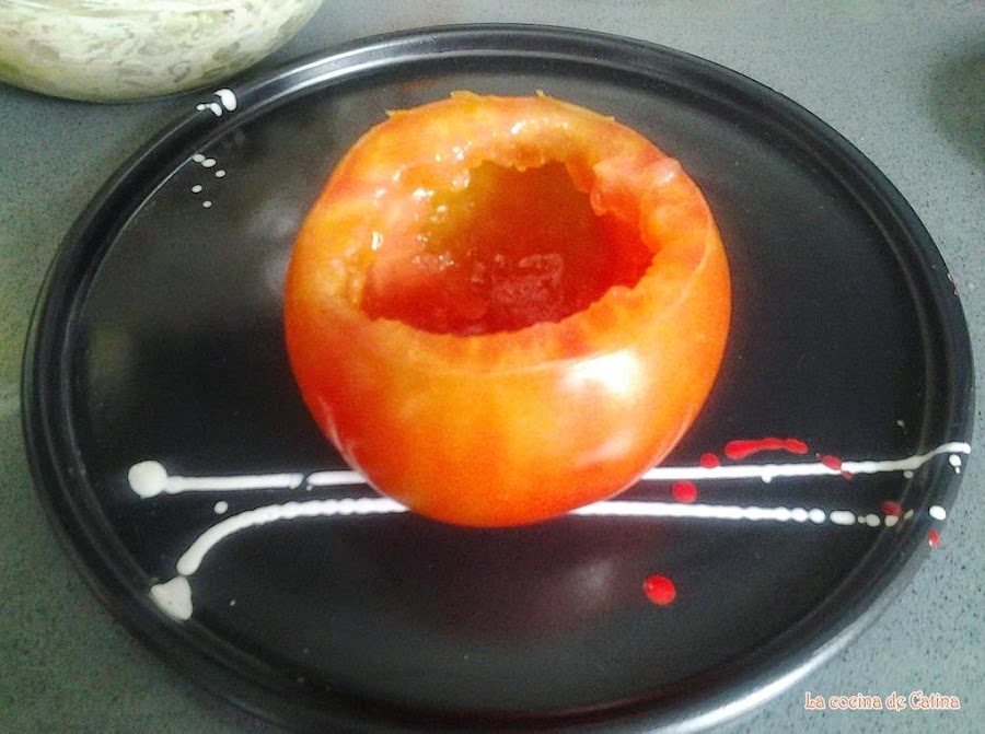 Cortar la parte superior de los tomates, y vaciar el interior, retirando la pulpa y colocar los tomates boca abajo para que pierdan el agua que les pueda quedar.