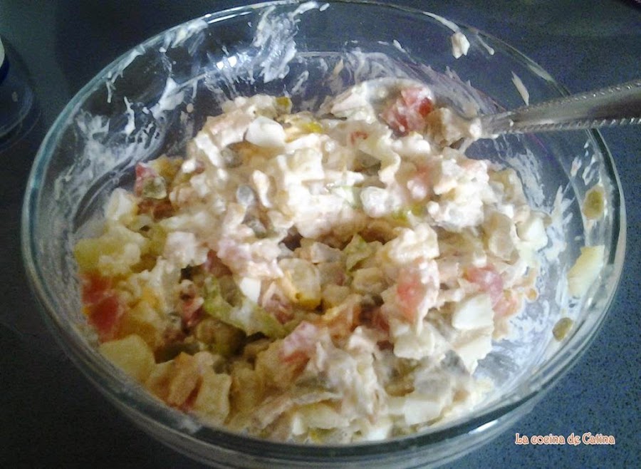 Añadimos la mahonesa, mezclamos todo bien y rellenamos los tomates con la esta mezcla.