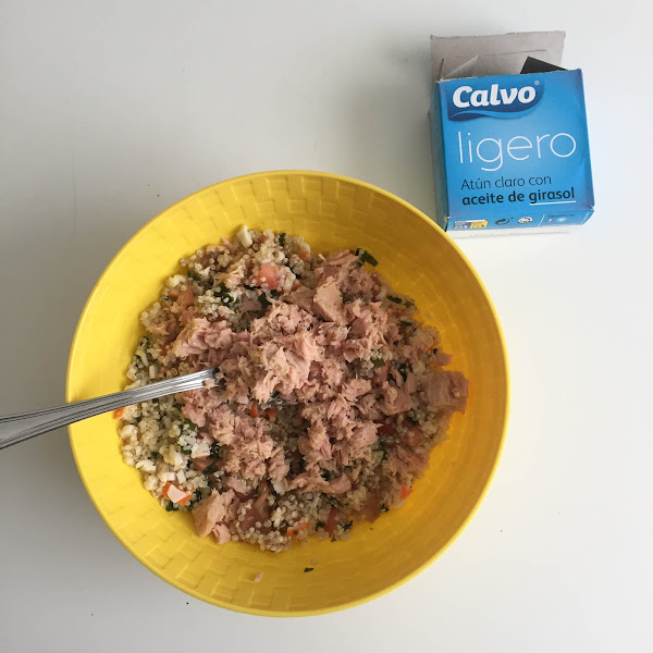 Y hasta aquí lo más complicado de la receta, el resto es coser y cantar. El siguiente paso es mezclar en un recipiente la quinoa con el alga, los palitos de cangrejo y el tomate picados muy pequeños y las dos latas de atún (reservando un poco para la decoración final).
