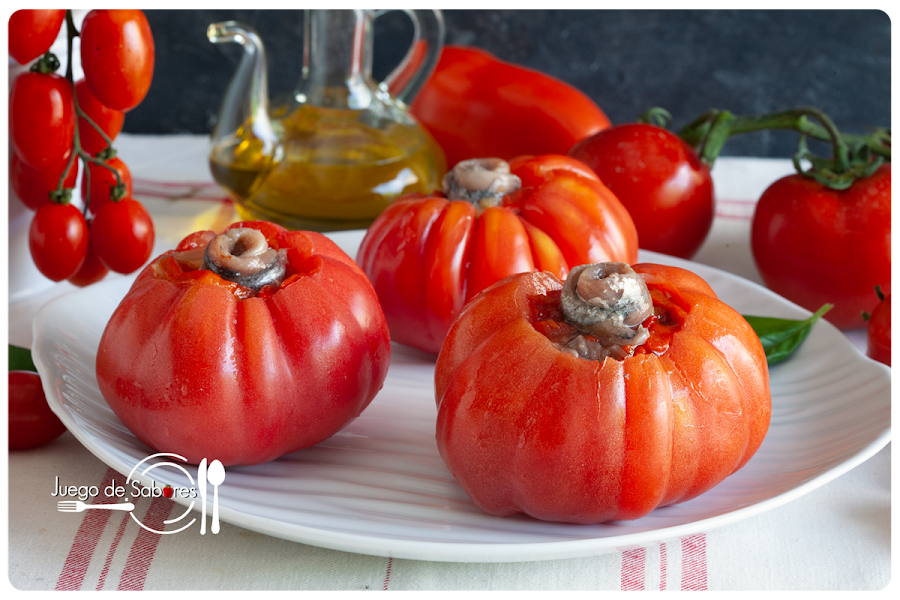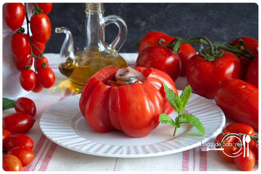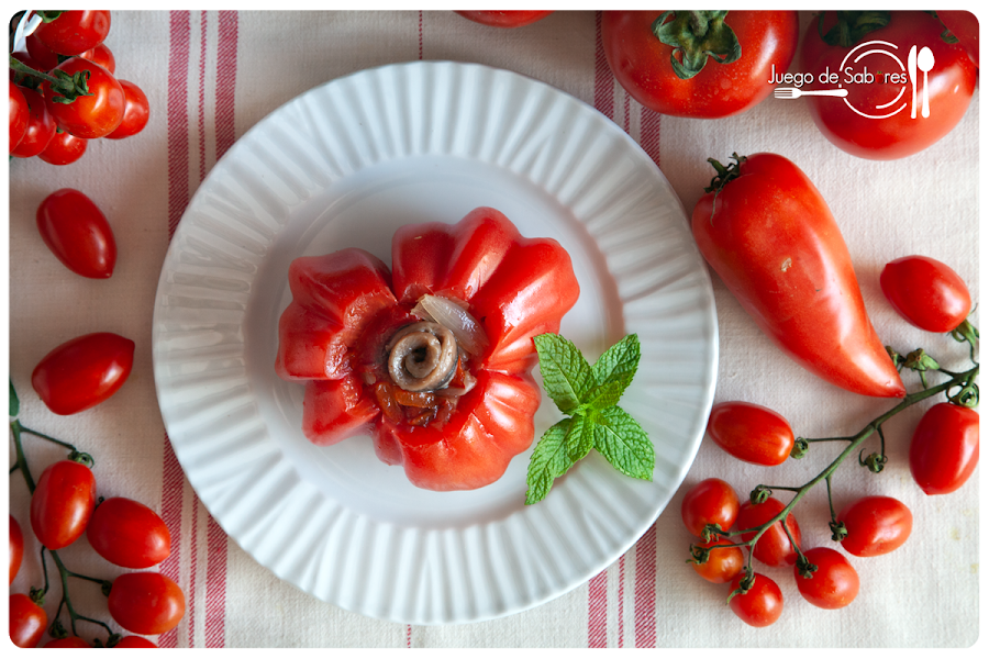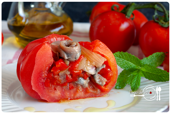 Receta fácil y veraniega. Hoy os proponemos rellenar unos tomates de la variedad Monterosa que son grandes, carnosos, con un ligero color rosado y de sabor dulce e intenso. Si no encontráis esta variedad siempre podéis elegir otra de características similares. Es importante que tenga un tamaño grande porque de lo que se trata es de rellenarlos. Habíamos hecho ya tomates rellenos pero en esta ocasión optamos por poner en el interior de estos apetitosos tomates una escalivada con trocitos de anchoa. Si hacéis la escalivada (pimiento, berenjena y cebolla) directamente en el fuego mucho mejor porque conseguiréis un sabor ligeramente ahumado. Otra opción es asarlos en el horno, aunque el resultado no es igual. Si le añadis unos trocitos de anchoa para contrarrestar el sabor dulce del tomate este sencillo plato llega a la excelencia.