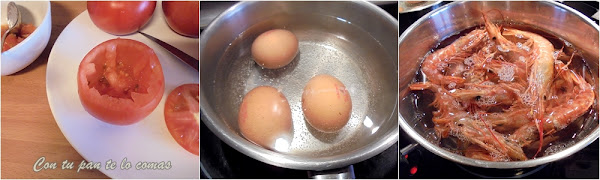 Para emplatar cortamos la lechuga en juliana, la aliñamos un poco con sal, aceite y vinagre y la colocamos en los platos. Rellenamos cada tomate y ponemos un gambón entero de los que habíamos reservado.