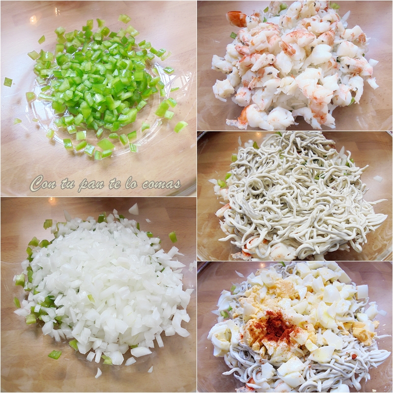 5. Pela los gambones (reserva 4 para decorar) y trocéalos. Añade a lo anterior.