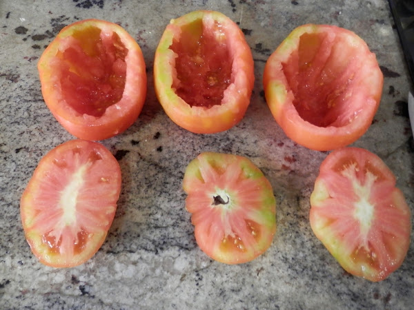 En los tomates , dejaremos una pared de medio dedo de grueso para cuando lo rellenemos no se venga abajo.
