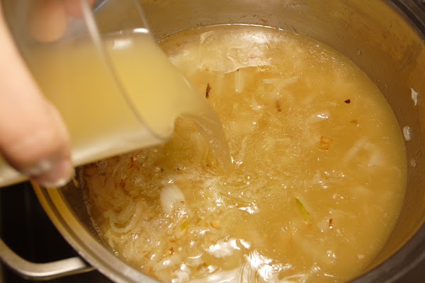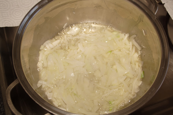Picamos finamente la cebolla y el ajo, los pochamos en una olla baja y ancha con un chorro de aceite de oliva. Cuando se doren vertemos el vino blanco y el caldo. Dejamos reducir casi por completo, que se vea el fondo de la olla.