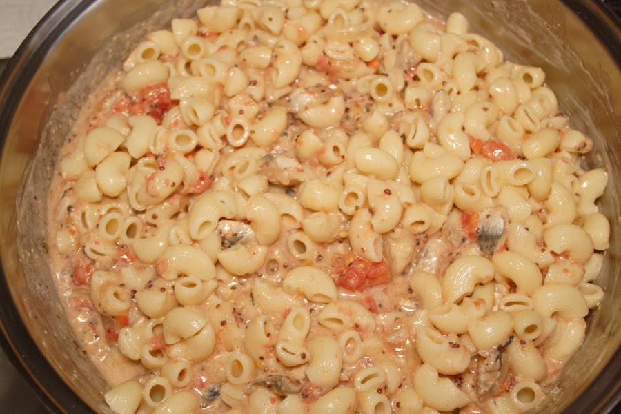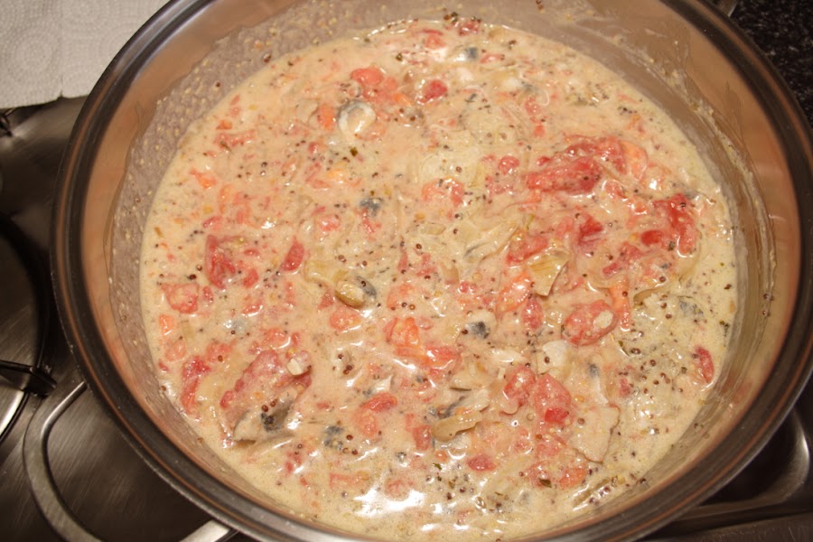 Añadimos la pulpa de los tomates, removemos y echamos la mostaza y la crema fresca. Seguimos removiendo, salpimentamos y dejamos que se cocine unos 8 minutos.