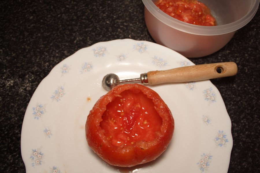 Lavamos los tomates, les quitamos la parte de arriba y con la ayuda de un vaciador (utensilio de cocina) o de una cuchara, los vaciamos, dejando las paredes de medio centímetro aproximadamente y los ponemos en una fuente de horno. Reservamos.