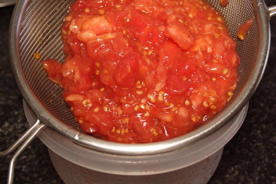 Escurrimos en un colador el exceso de agua de la pulpa de los tomates y reservamos.
