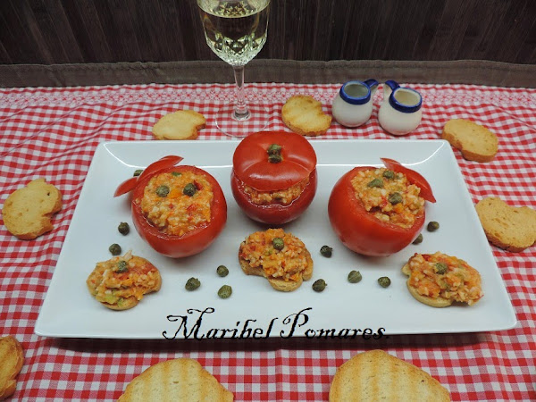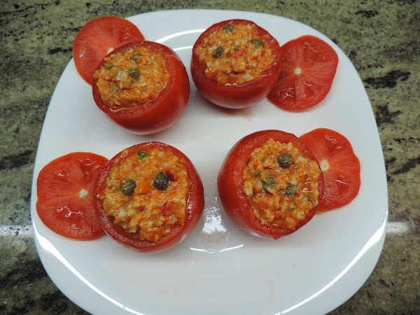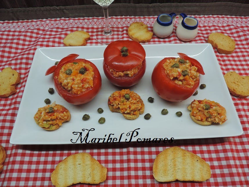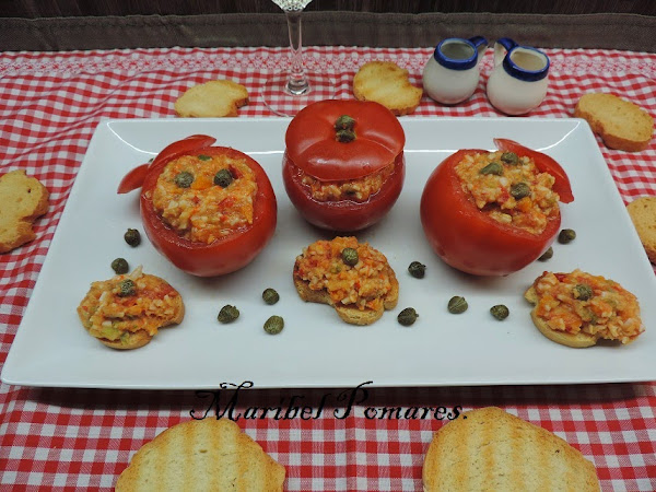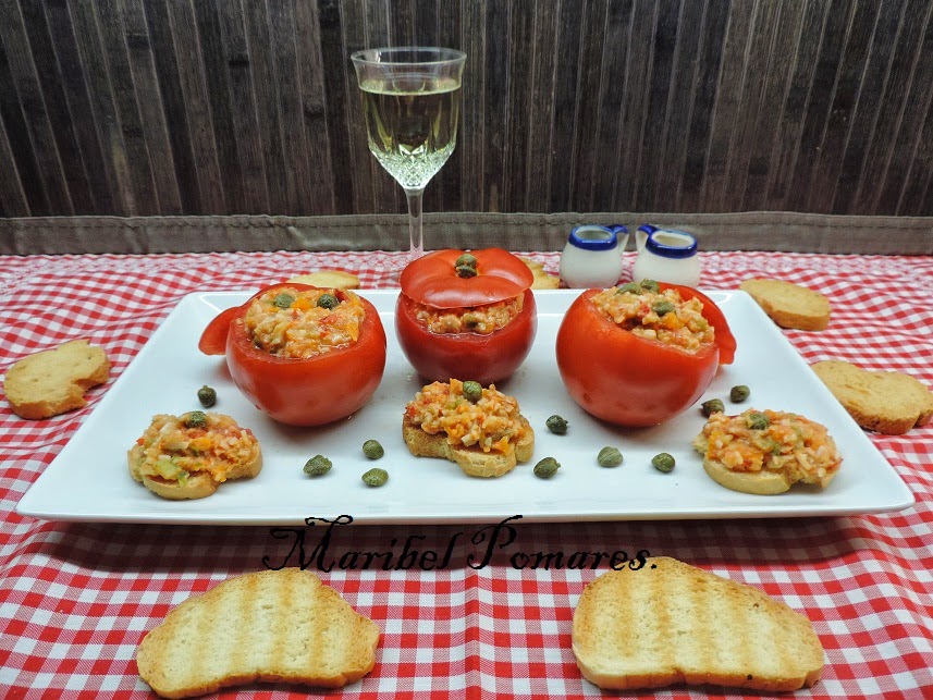 Con una cuchara los rellenamos los tomates.