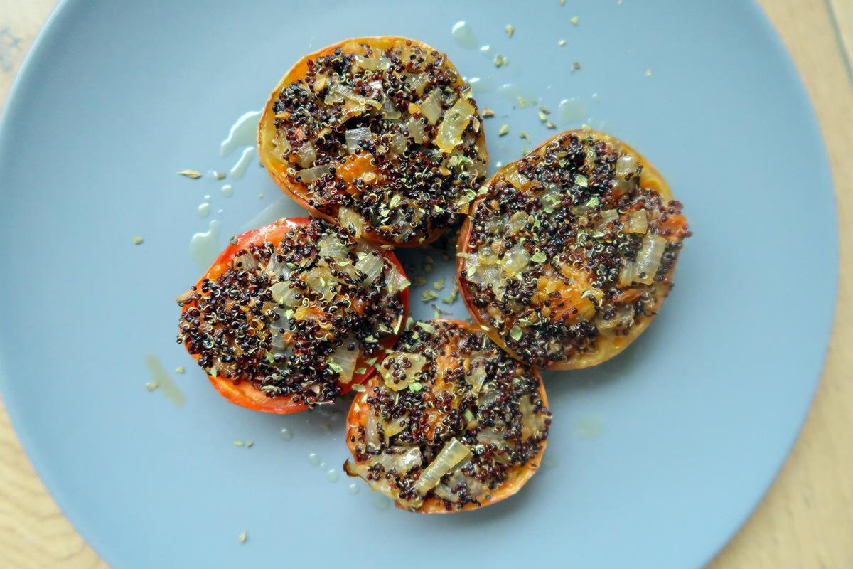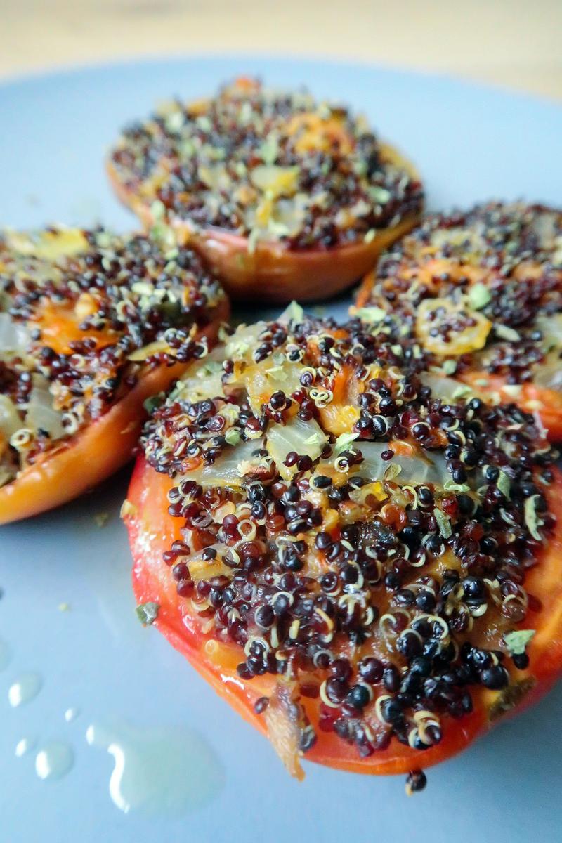 Mientras hervimos la quinoa, lavamos los tomates, los partimos por la mitad y sacamos toda la pulpa dejando un borde grueso alrededor.