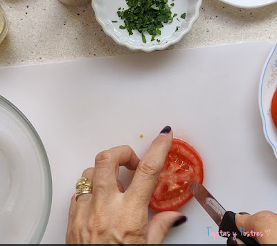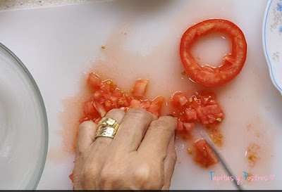 Vaciamos la carne del tomate y la picamos pequeñita.
