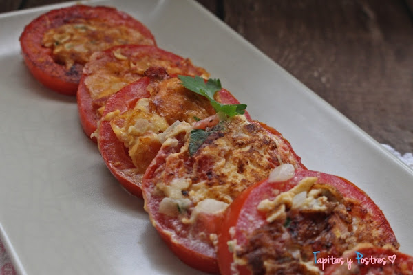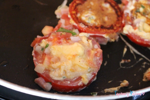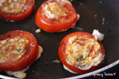 En una sartén con un poco de aceite ponemos las rodajas de tomate que habremos secado con un papel absorbente. Echamos en el centro una cucharada sopera de la mezcla de huevo. Ponemos un poquito de queso rallado encima y dejamos que se cuaje por un lado.