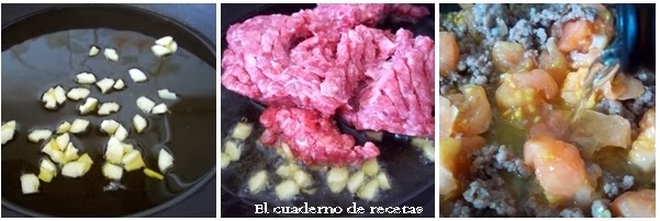 En una sartén con un poco de aceite añadimos los ajos troceados pequeños y antes de que cojan color, añadimos la carne picada, sazonamos con sal y pimienta, y cuando cambie de color añadimos la pulpa de los tomates. En caso de hacerlo con la cebolla, hacer el mismo proceso con ella.