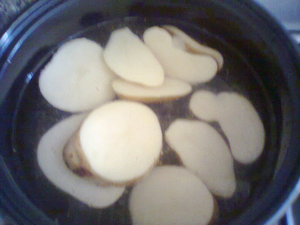 cortamos las papas y las hervimos con una cucharadita de sal gruesa, con la cáscara, la vamos a pelar cocida.
