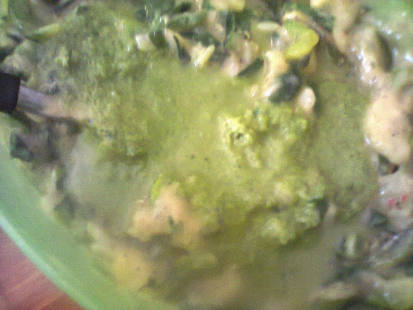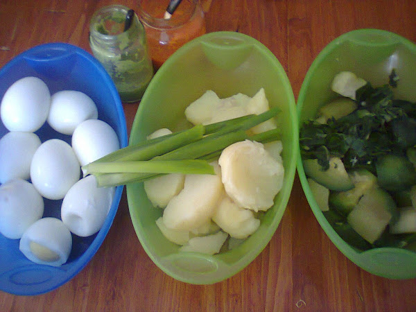 condimento la verdura con albahaca y salsa de morrón verde con cilantro, le agrego lo que queda del puré y mezclo bien.