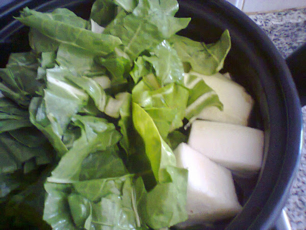 en otra olla ponemos las verduras cortadas en cuadrados a hervir con una cucharadita de sal gruesa