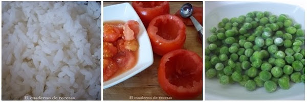 Cortamos la parte de arriba de los tomates y los vaciamos con cuidado de no romperlos. Los colocamos boca abajo en un plato para que suelten todo el agua.