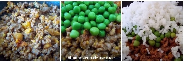 Dejamos hacer hasta que se consuma casi todo el líquido y entonces añadimos los guisantes y el arroz.
