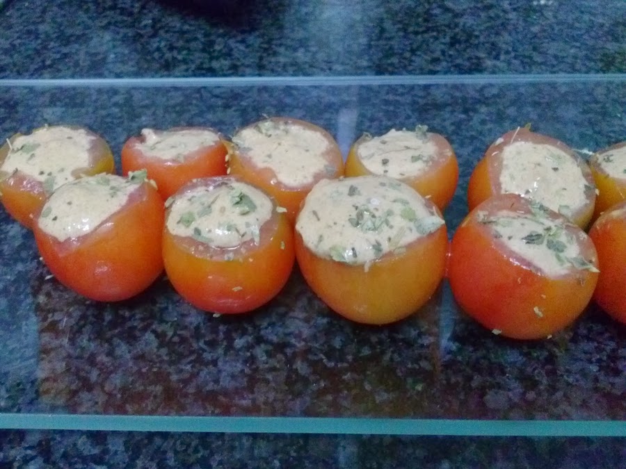 Introducimos la pasta en una manga pastelera y rellenamos los tomatitos.