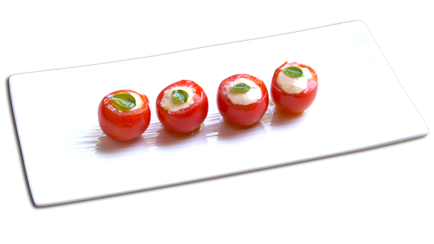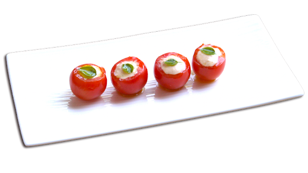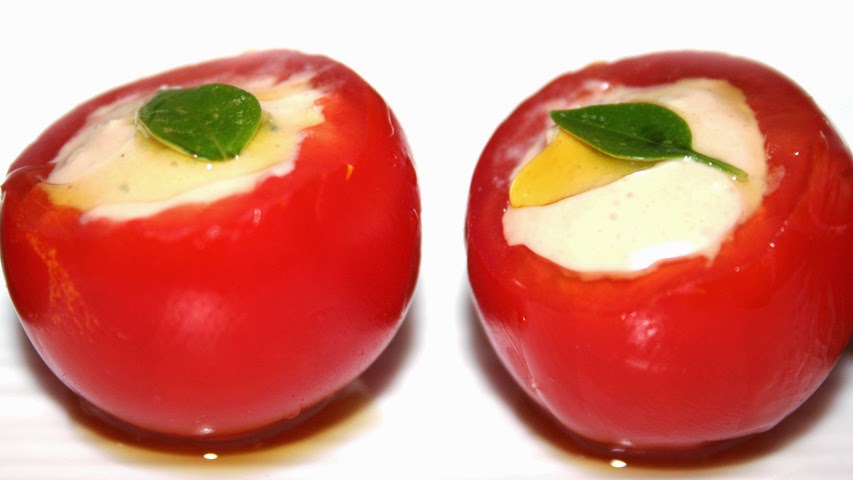 Al comerse de un bocado, explotan en la boca refrescándonos con todo el sabor del Mediterráneo. Su interior es una especie de paté que he elaborado con la propia a gua del tomate, queso fresco (en esta ocasión he utilizado queso de untar), aceitunas de Álora (con DOP), un par de anchoas o tres, una ramita de albahaca fresca de hoja pequeña, pimienta negra molida y aceite de oliva de buena calidad. No le he puesto sal porque las anchoas aportan bastante.