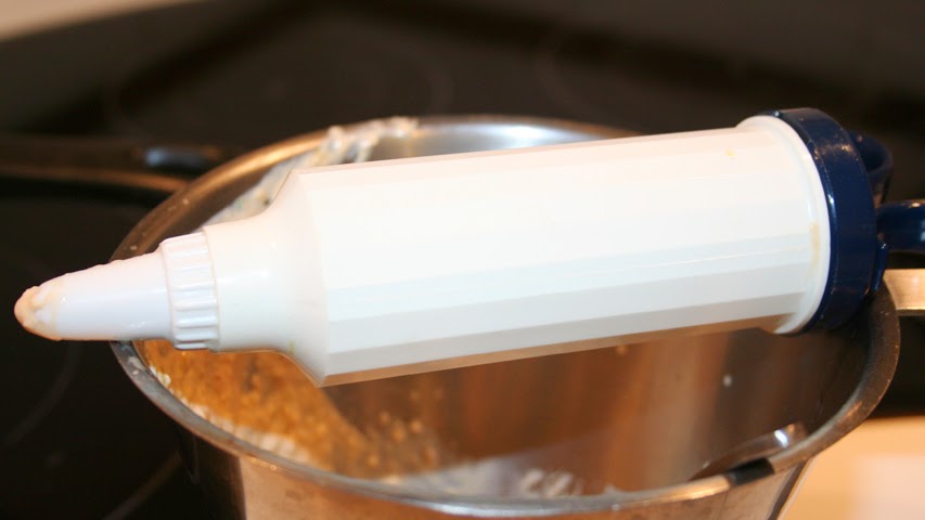Yo he usado esta "jeringa" de decorar pasteles para rellenar pero podéis usar una cucharilla o una manga pastelera improvisada con una bolsa de plástico