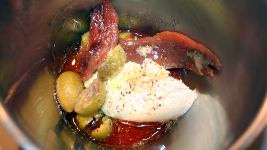 En un vaso de la trituradora, echa el agua de vegetación de los tomates utilizando un colador para que no caigan las pepitas y demás. Añade a este vaso el queso, las anchoas, las aceitunas sin hueso, unas hojas de albahaca, sal, pimienta molida y unas gotas del mejor aceite de oliva que te puedas permitir.