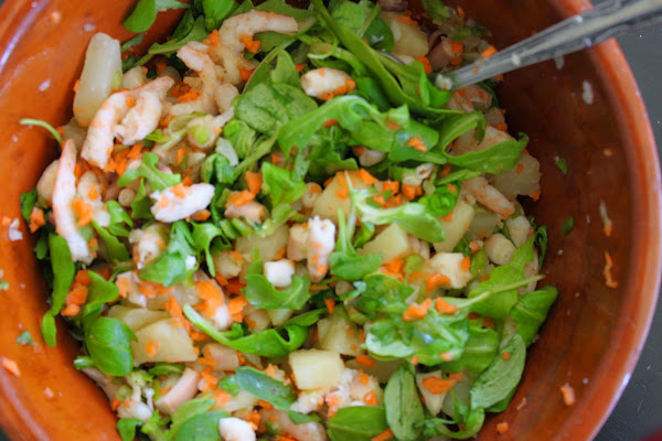 Mezclar todos los ingredientes en un cuenco y aliñar.