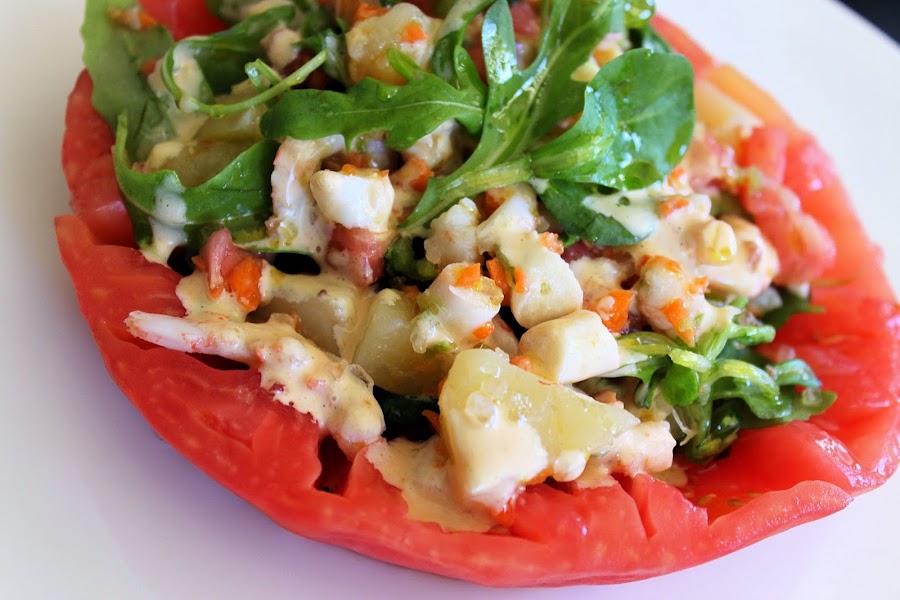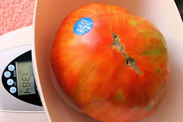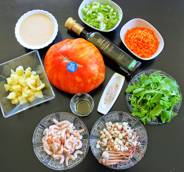 Después de probar estos tomate y tener en mis manos este ejemplar de 1,387 kg. no podría enmascarar su delicioso sabor pero tampoco quería hacer simplemente el tomate picado con sal y aove (que está de lujo así) quería darle un toque saliendo de lo simple así que, le quité la piel que, por cierto, se hace facílmente; lo abrí por la mitad, vacié dejándolo hueco y piqué en trozos muy pequeños su parte interior que mezclé para rellenarlo con....