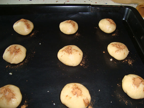 Hacer bolitas del tamaño de una nuez y poner en la bandeja de horno, espolvorear un poco de canela molida por encima.