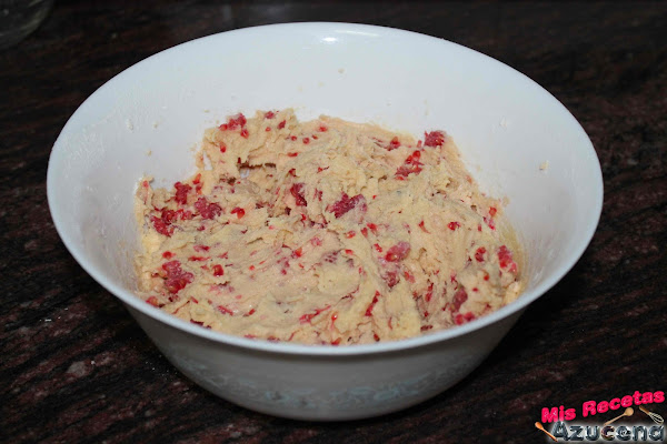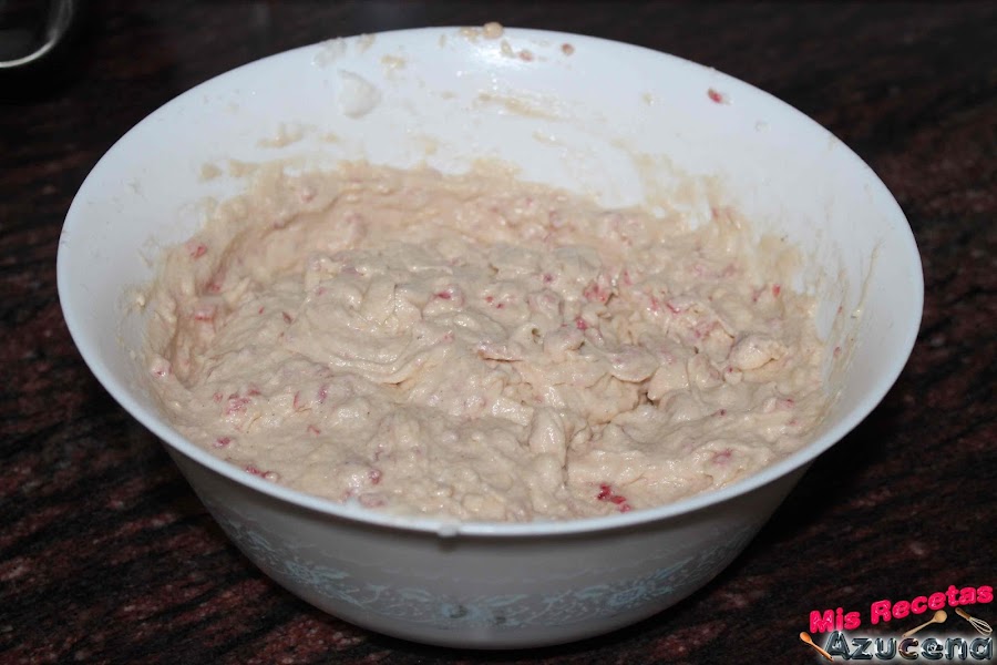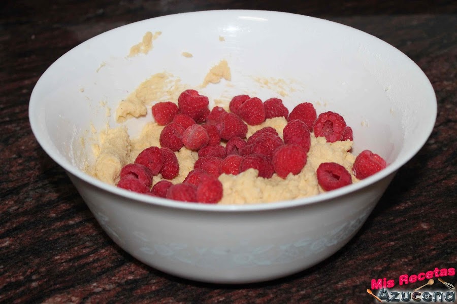 Ahora podremos las frambuesas y con ayuda de un tenedor las machacaremos un poco, no mucho, lo que buscamos es que nos queden trocitos.
