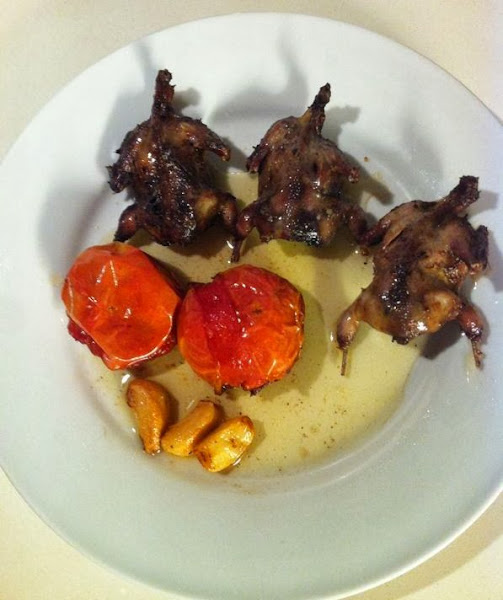 2º En una cazuela poner 15 cucharadas de aceite de oliva, los ajos enteros, los tomates partidos por la mitad y la carne. Sofreír a fuego medio hasta que la carne esté dorada (30 minutos aprox).