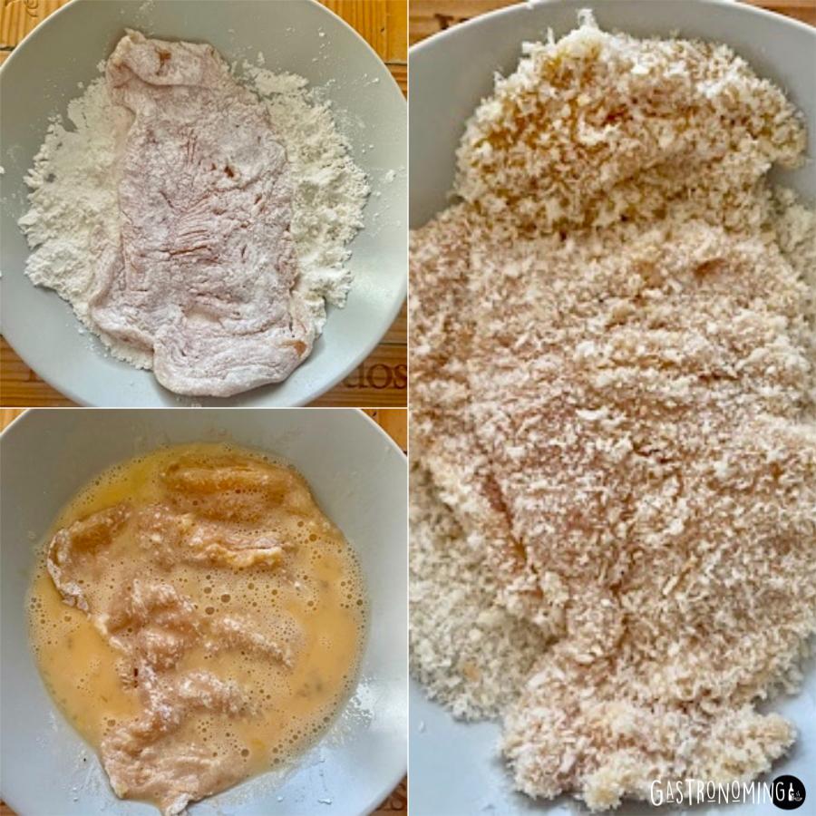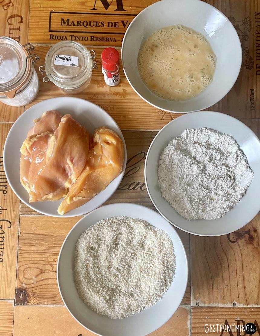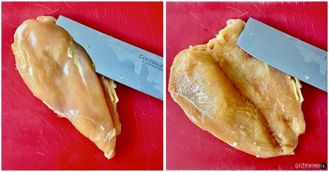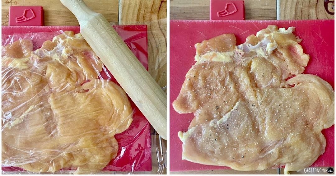 1. Colocamos las pechugas de pollo sobre una tabla que no resbale y con ayuda de un cuchillo bien afilado las vamos hacer un corte mariposa, es decir, por la mitad, pero sin llegar a cortar del todo la pieza si la pechuga es grande y si es pequeña, podrás espalmarla directamente, esto depende de que tamaño quieres los filetes.2. Una vez cortadas, las cubrimos con film y le vamos dando golpes suavemente con un espalmador o un rodillo, también puede hacerlo con la parte de atrás del cuchillo, pero cuidado de romperlo, así hasta hacer un filete amplio y de un grosor de entre 1,5 y 2 centímetros. Echamos sal y pimienta blanca por ambos lados y reservamos en frío.