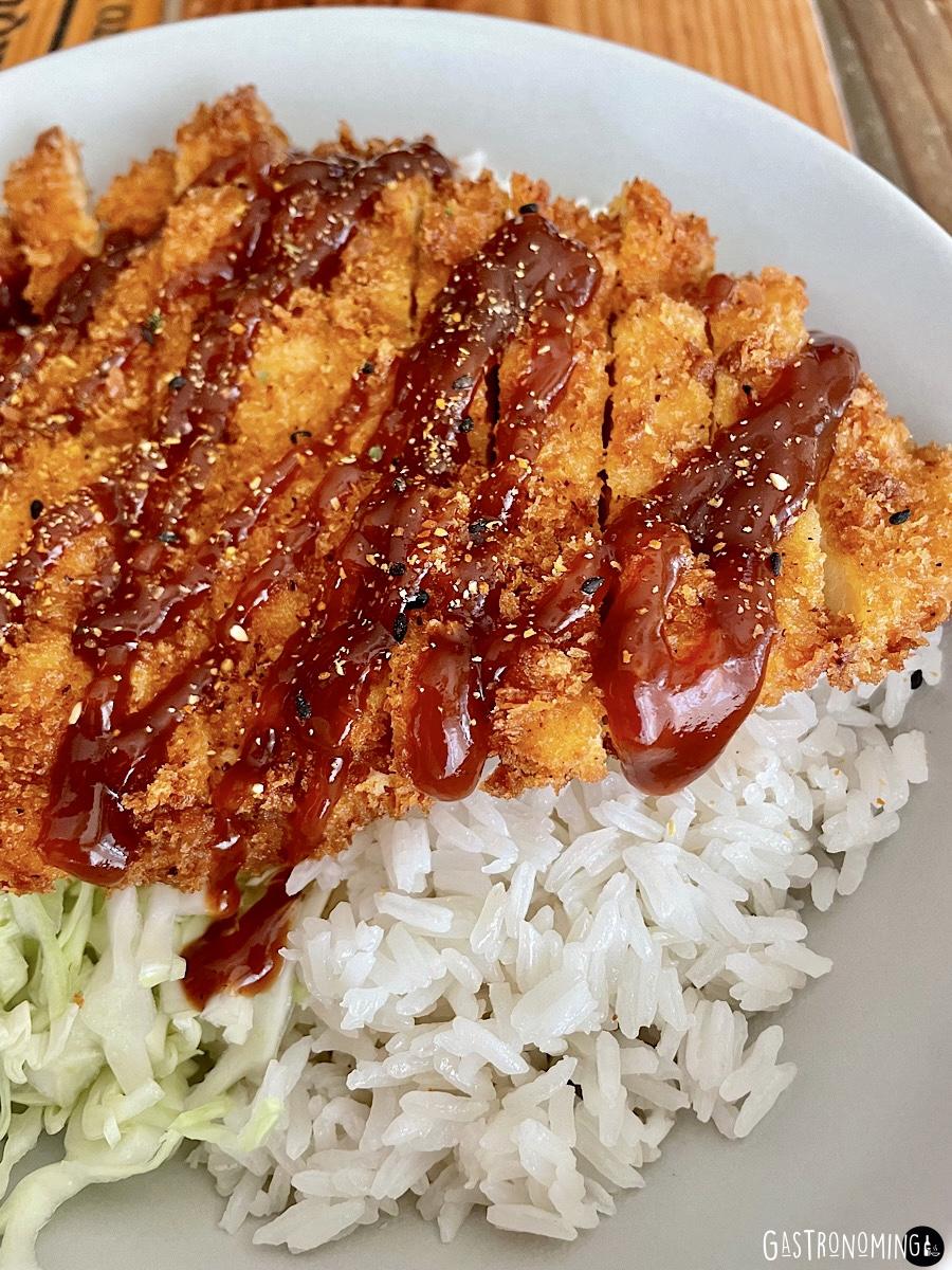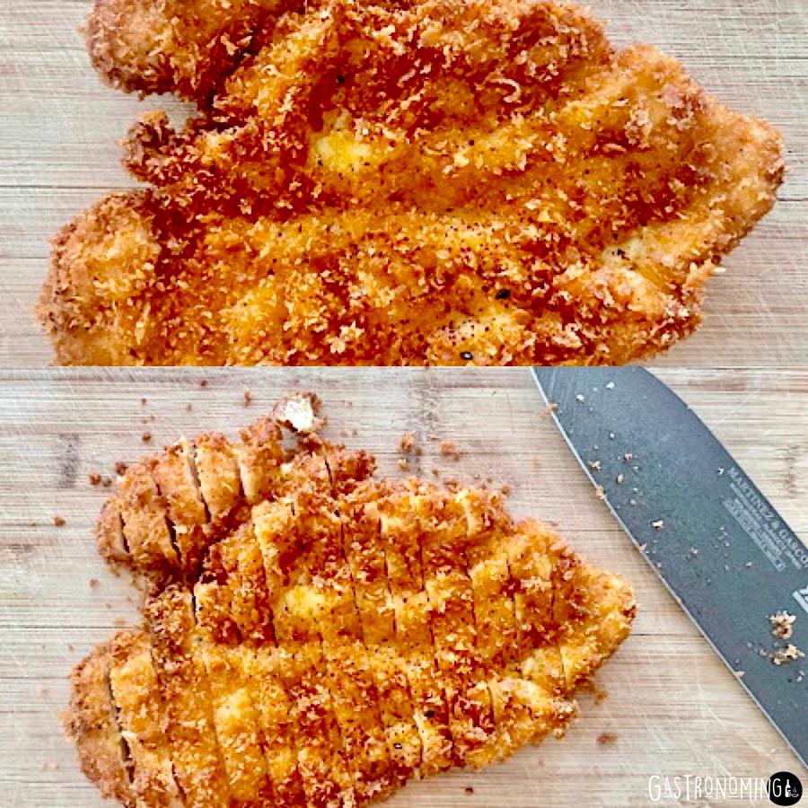 6. Servimos inmediatamente y si queremos, podemos servir cortado en finas tiras con un toque más de shichimi togarashi por encima. Si quieres puedes rociar un poco de salsa tonkatsu por encima del pollo frito y acompaña con verduras al vapor, ensalada o arroz blanco cocido y col fresca cortada en juliana muy fina previamente lavada.