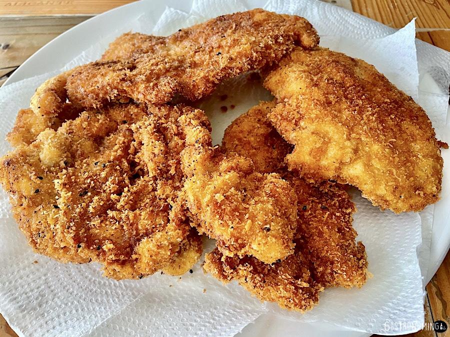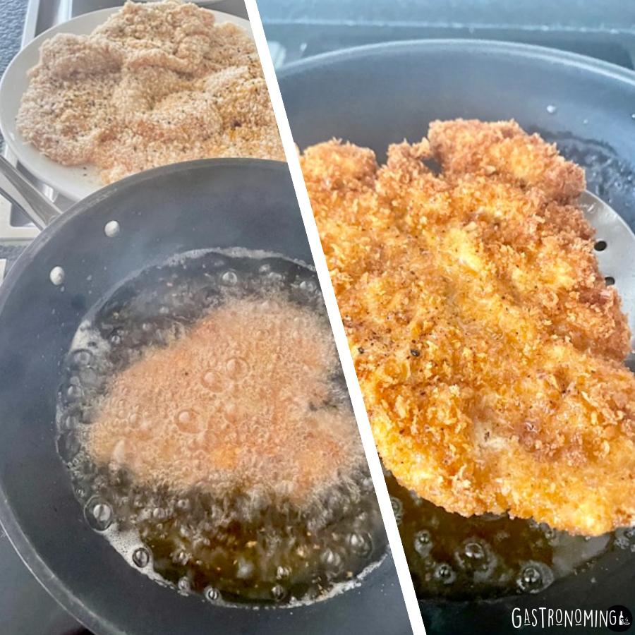 5. Vamos a freír los filetes en abundante aceite vegetal a fuego medio-alto hasta dorar bien el pollo. Retiramos sobre papel absorbente de cocina para quitar exceso de grasa. Repetimos con el otro filete.