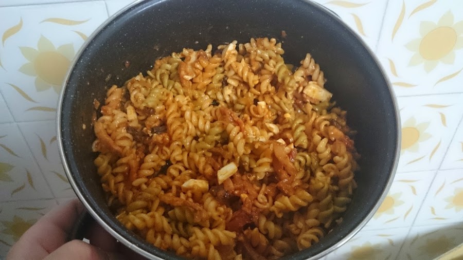 Cuando esté escurrida pondremos en una cazuela la pasta y mezclaremos la salsa que tenemos reservada, lo pondremos durante unos 5 min. a fuego lento removiendo de vez en cuando para que no se pegue y se mezcle bien, y ya tendremos un plato fácil y delicioso, buen provecho