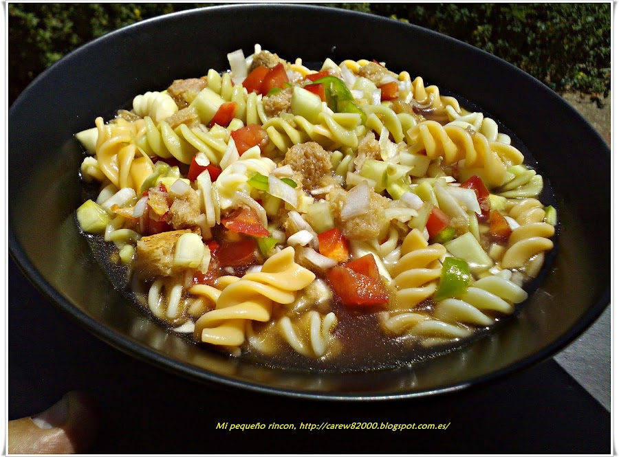 Ponemos la pasta a cocer en una cazuela con una pizca de sal y aceite y la dejamos cocinar hasta tenerla al dente, retiramos y dejamos escurrir lavándolos para enfriarlos a si cortamos la cocción.