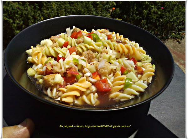Sacamos la vinagreta de la nevera y añadimos la pasta, y mezclamos todo muy bien después volvemos a meter al bol en la nevera un par de horas hasta que la sirvamos.