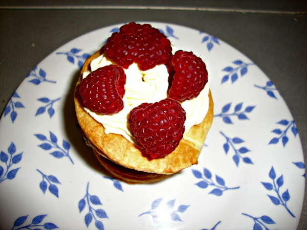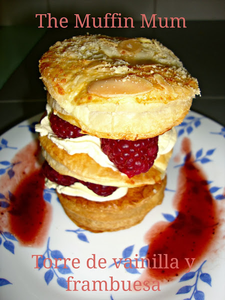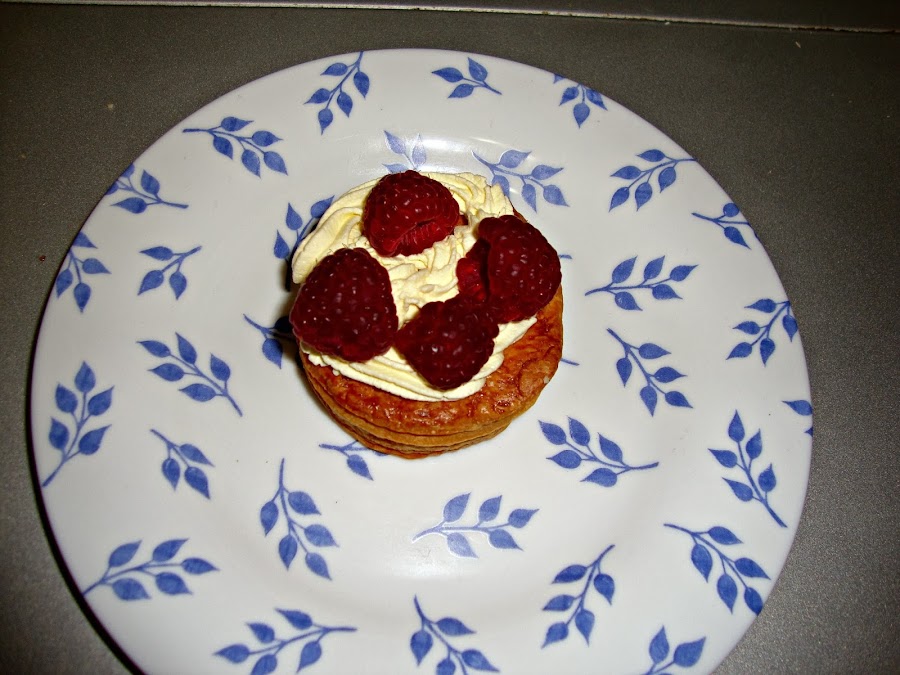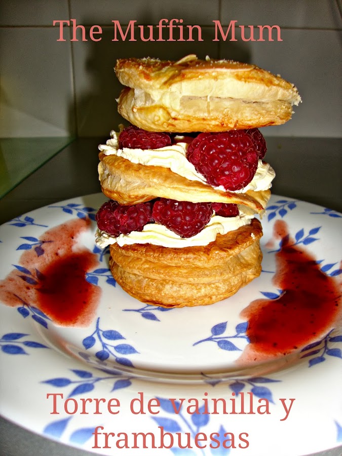 La decoración es bien sencilla, se pone una capa de hojaldre, encima se pone una capa de crema de vainilla y unas frambuesas, se pone otra capa de hojaldre y se repite el proceso y en la parte superior se pone la tapa con las almendras.
