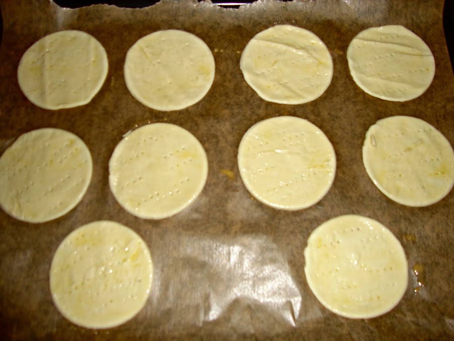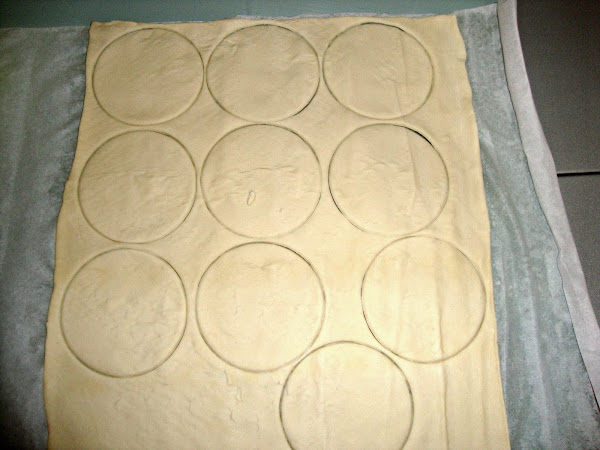 Las separaciones son de hojaldre, simplemente se corta en círculos (o el cortador que tengamos) y se pintan con huevo batido y se pinchan para que no suba mucho, se ponen en el horno caliente a 200ºC durante 15 minutos poniendo un papel de horno encima.