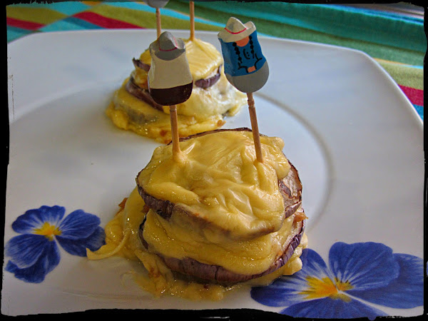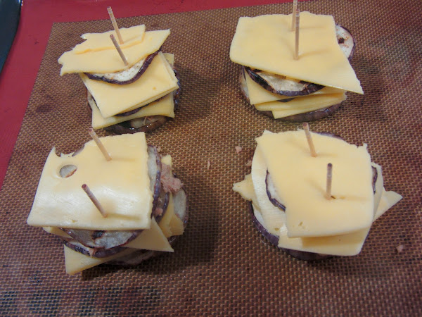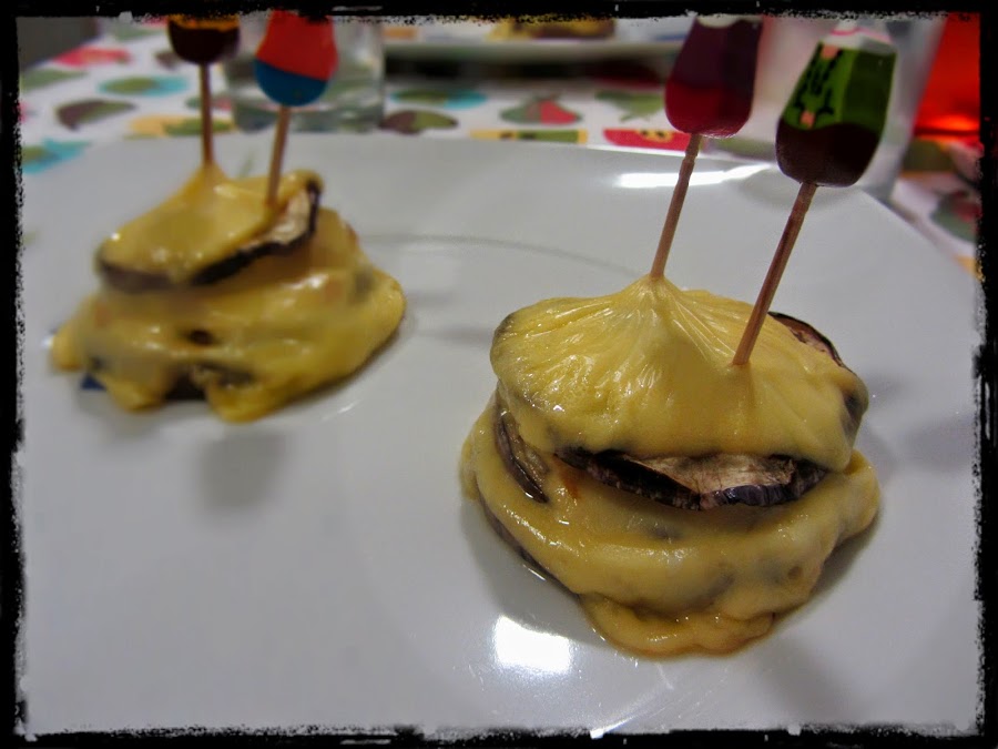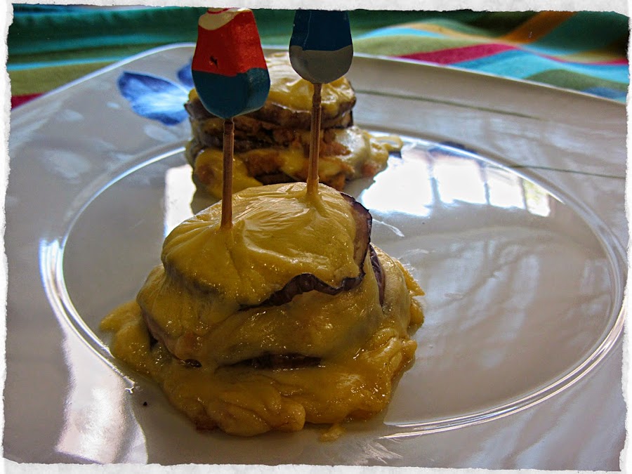 Colocamos otra rodaja de berenjena, más atún, otra capa de queso, otra berenjena, y cubrimos al final con queso. Sujetamos todo con unos palillos.