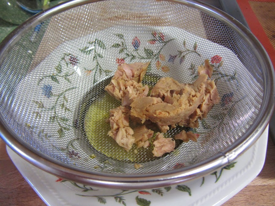 Ponemos a escurrir el atún en un colador, y lo desmigamos (aquí está aún sin desmigar).